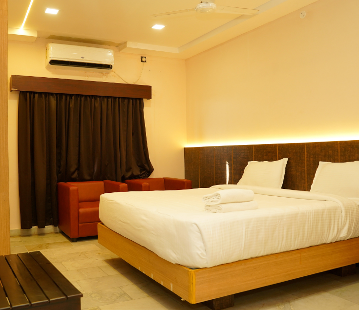 Our Double A/C Room is thoughtfully designed to provide comfort and convenience for couples, families, and business travelers. Featuring a spacious layout, comfortable bedding, and modern amenities, the room ensures a relaxing and pleasant stay. Equipped with air conditioning, clean interiors, and essential facilities, it offers the perfect balance of comfort and functionality for a refreshing experience. Experience comfort and convenience in our well-appointed Double A/C Room, designed for both business and leisure travelers. At VPN Residency, we ensure a relaxing stay with modern amenities and a pleasant ambiance.